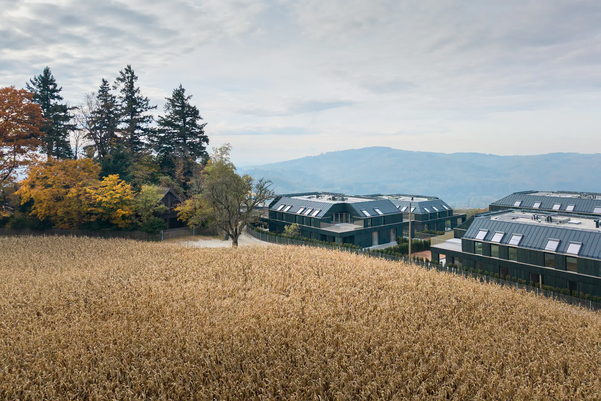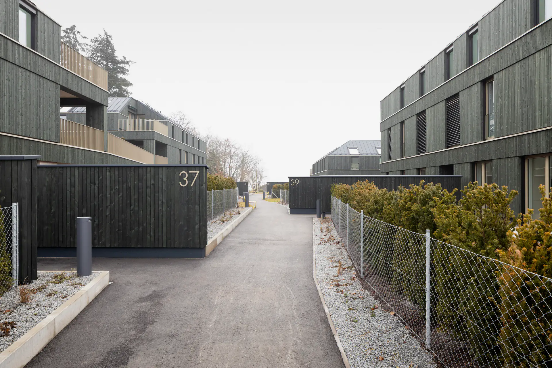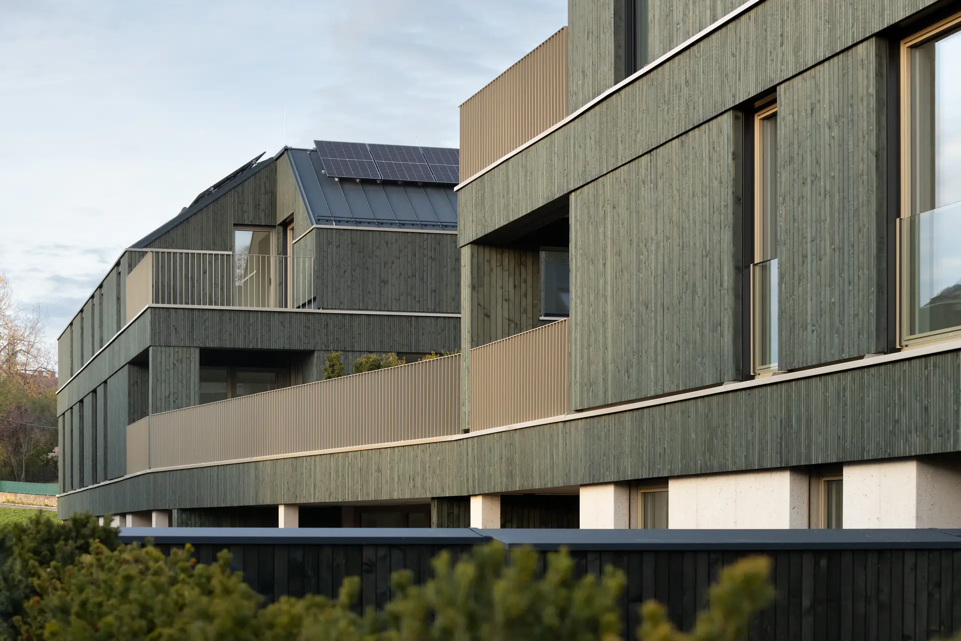 Ein besonderes Highlight sind die 21 Wohnungen mit privaten Eigengärten, die ein naturnahes Wohnerlebnis mit hohem Erholungswert ermöglichen. Alle Gebäude fügen sich harmonisch in die grüne Umgebung ein und sind mit einer stilvollen, dunkelgrünen Holzfassade gestaltet, die der Wohnanlage einen modernen und gleichzeitig natürlichen Charakter verleiht.